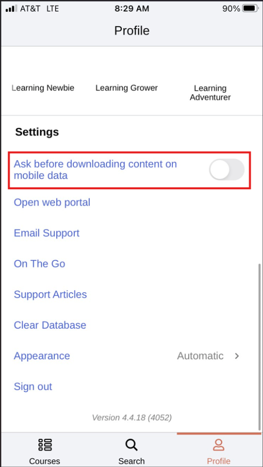 "Ask before downloading content on mobile data" allows you to control whether you want the app to ask before using mobile data to download content. If toggled on, it will ask if you are not connected to Wifi. If toggled off, it will use mobile data to download content when not connected to Wifi: