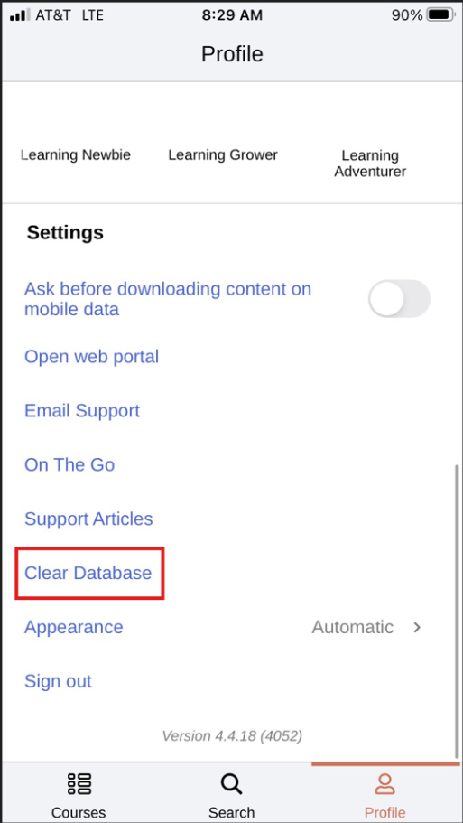 "Clear database" will clear all of your downloaded courses. This will not reset the progress on your courses as long as you connect your device to the internet before clearing the database: