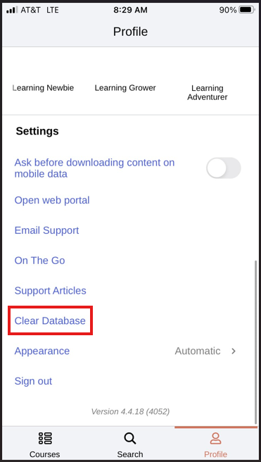 Clearing your database will clear any downloaded course content from your phone. In order to ensure none of your progress made in the course is lost, please connect to the internet before clearing the database to allow your course progress to sync to the Training database.