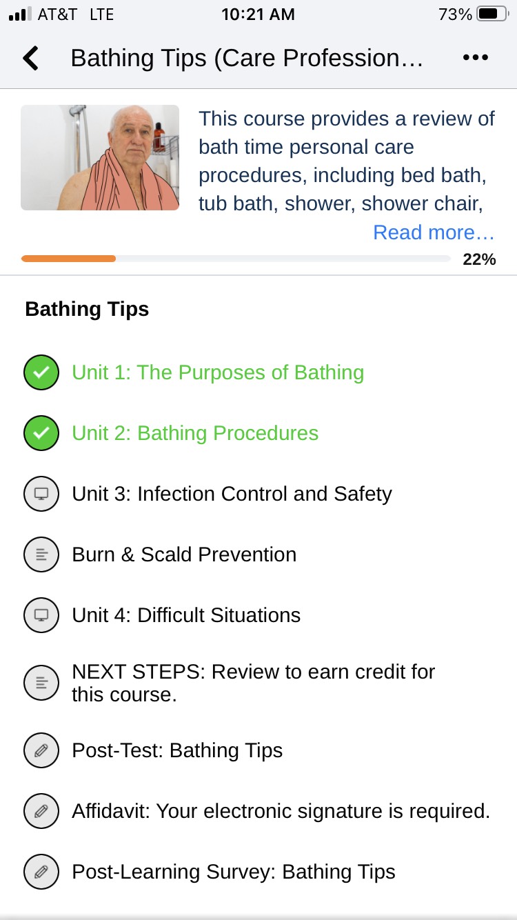 When you have a course open, you'll be able to see your course progress as indicated by the icons next to the names of each unit. We recommend completing a full unit before taking a break and stepping away from your training. This will help ensure progress is saved successfully.